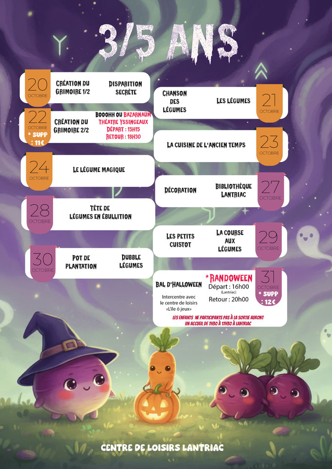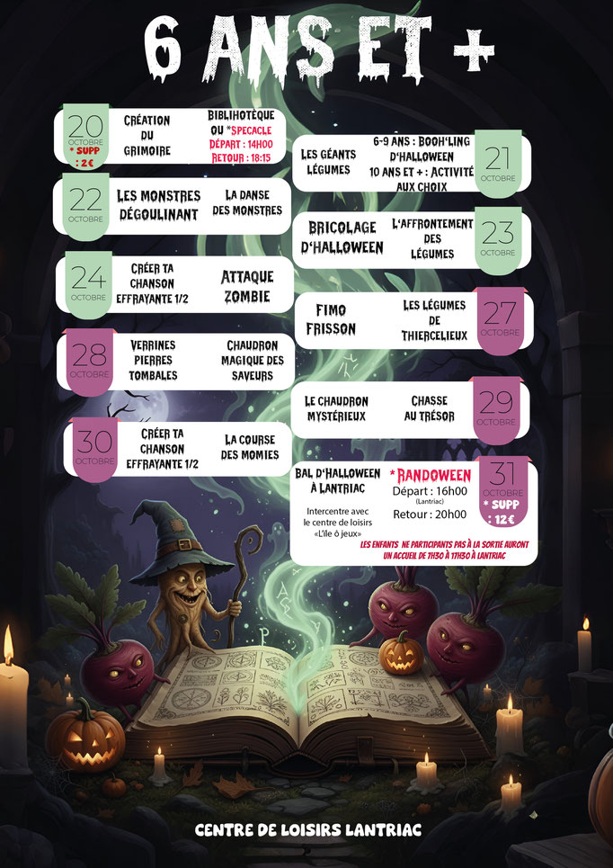 Préparez-vous à une aventure frissonnante et gourmande au Centre de Loisirs "Le Manège des enfants" ! Du 20 octobre au 31 octobre 2025, nous plongeons dans l'univers mystérieux et délicieusement effrayant du thème : "Le Grimoire des Légumes Disparus" !